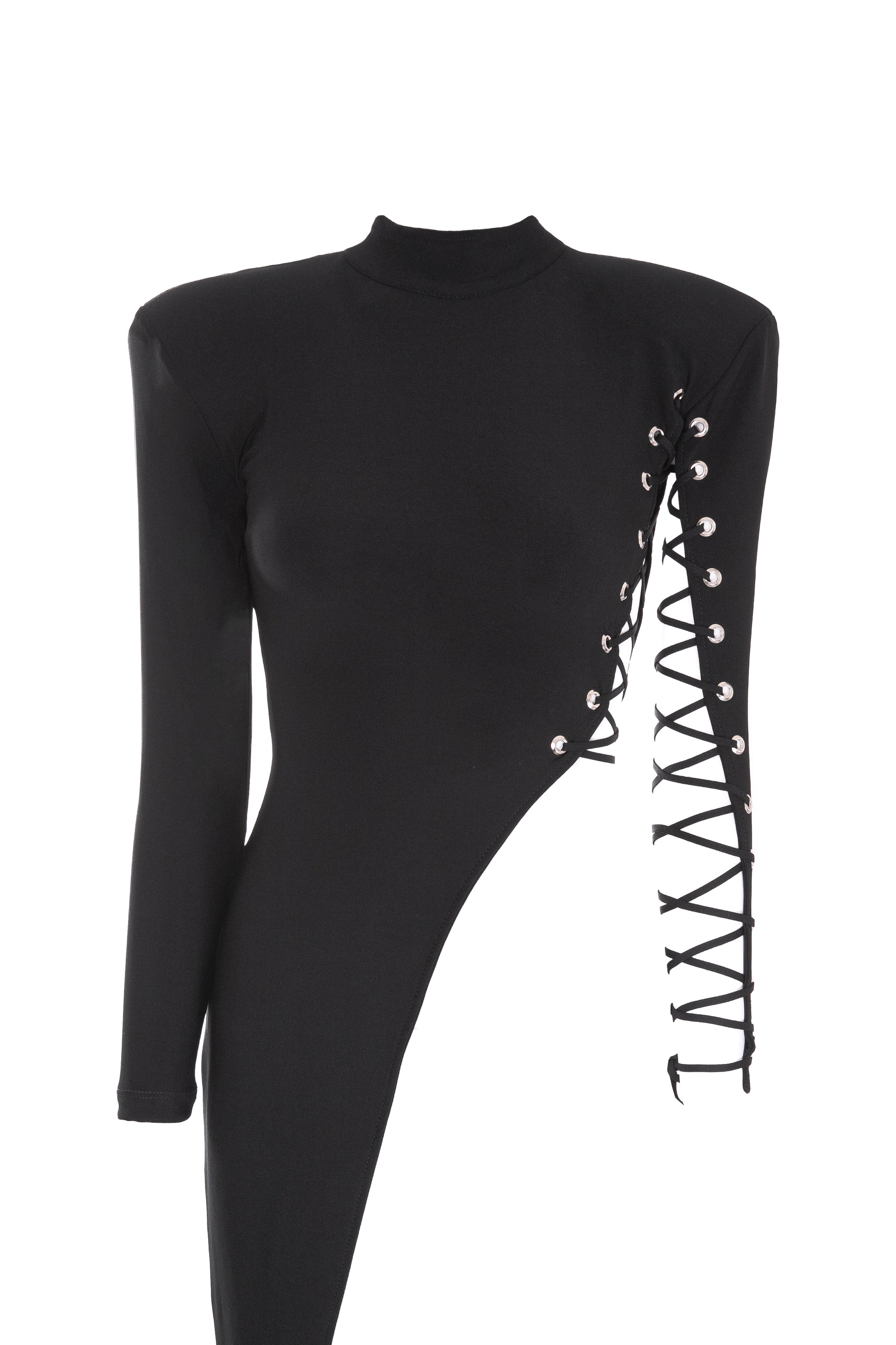 Top asimétrico en negro profundo que abraza el cuerpo como una segunda piel y se prolonga en una cola larga hasta el suelo. Un solo costado se abre y se reconstruye con cordones entrecruzados sobre ojales metálicos, revelando la piel de forma precisa y provocadora.
